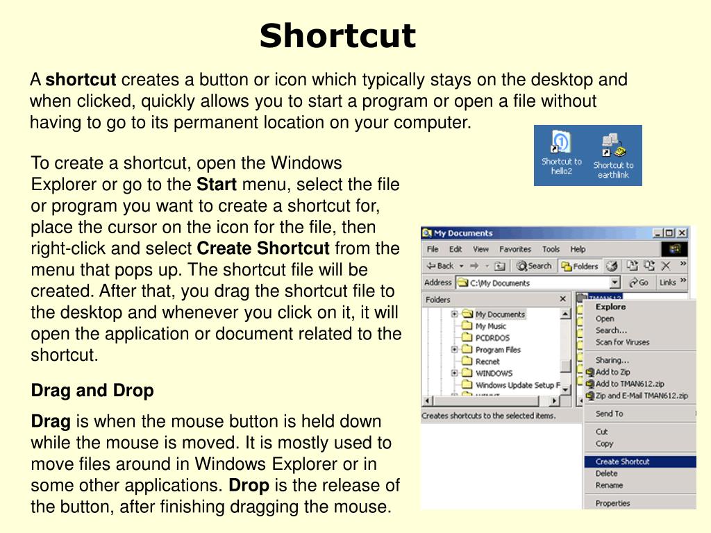 Shortcut A shortcut creates a button or icon which typically stays on the desktop and when clicked, quickly allows you to start a program or open a file without having to go to its permanent location on your computer. To create a shortcut,open the Windows Explorer or go to the Start menu, select the file or program you want to create a shortcut for, place the cursor on the icon for the file, then right-click and select Create Shortcut from the menu that pops up. The shortcut file will be created. After that, you drag the shortcut file to the desktop and whenever you click on it, it will open the application or document related to the shortcut. Drag and Drop Drag is when the mouse button is held down while the mouse is moved. It is mostly used to move files around in Windows Explorer or in some other applications. Drop is the release of the button, after finishing dragging the mouse.