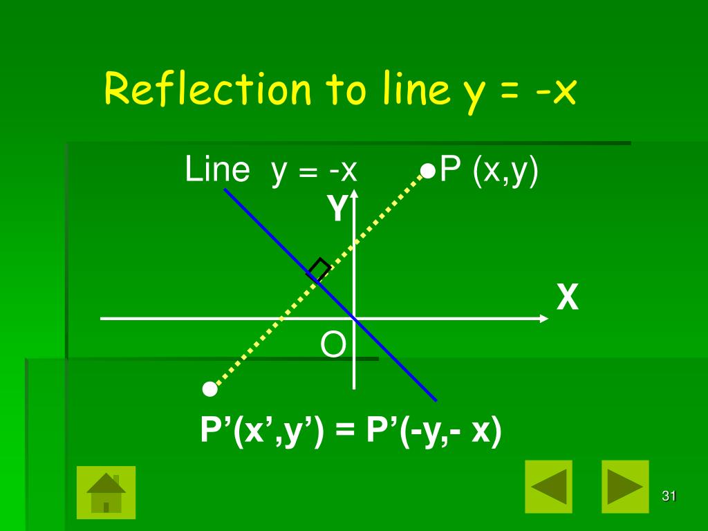 Reflection to line y = -x Line y = -x ●P (x,y) Y X O ● P’(x’,y’) = P’(-y,- x)