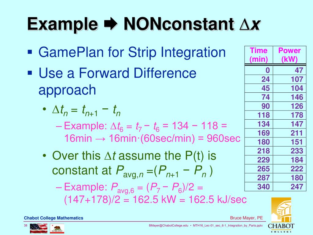 Example NONconstant∆x • GamePlan for Strip Integration • Use a Forward Difference approach • ∆tn = tn+1 − tn • Example: ∆t6 = t7 − t6 = 134 − 118 = 16min → 16min·(60sec/min) = 960sec • Over this ∆t assume the P(t) is constant at Pavg,n =(Pn+1 − Pn ) • Example: Pavg,6 = (P7 − P6)/2 = (147+178)/2 = 162.5 kW = 162.5 kJ/sec
