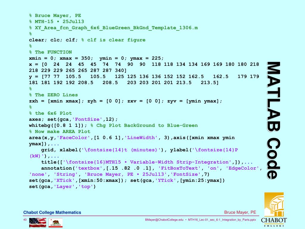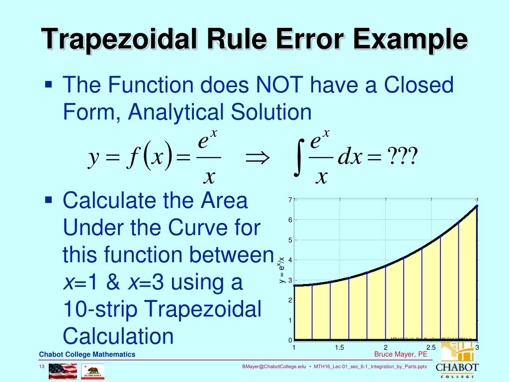 Chabot Mathematics. §6.2 Numerical Integration. Bruce Mayer, PE Licensed Electrical & Mechanical Engineer BMayer@ChabotCollege.edu. 6.1. Review §. Any QUESTIONS About §6.1 → Integration by Parts, Use of Integral Tables Any QUESTIONS About HomeWork §6.1 → HW-01. §6.2 Learning Goals.