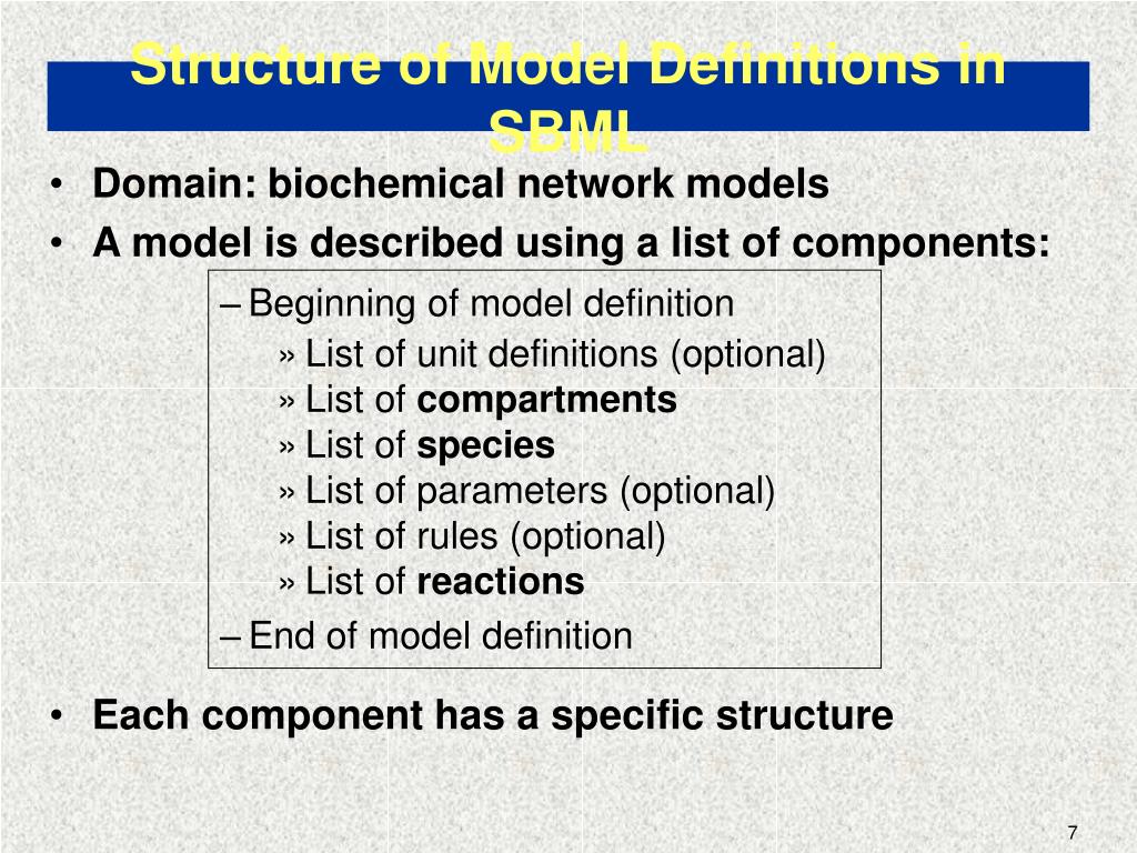 Structure of Model Definitions in SBML • Domain: biochemical network models • A model is described using a list of components: • Beginning of model definition • List of unit definitions (optional) • List of compartments • List of species • List of parameters (optional) • List of rules (optional) • List of reactions • End of model definition • Each component has a specific structure