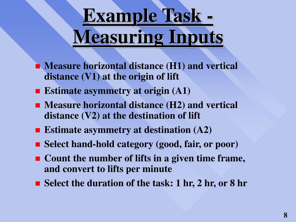 Example Task - Measuring Inputs • Measure horizontal distance (H1) and vertical distance (V1) at the origin of lift • Estimate asymmetry at origin (A1) • Measure horizontal distance (H2) and vertical distance (V2) at the destination of lift • Estimate asymmetry at destination (A2) • Select hand-hold category (good, fair, or poor) • Count the number of lifts in a given time frame, and convert to lifts per minute • Select the duration of the task: 1 hr, 2 hr, or 8 hr