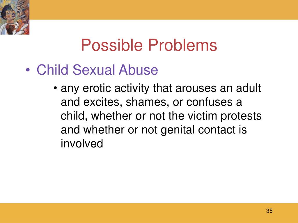 Possible Problems • Child Sexual Abuse • any erotic activity that arouses an adult and excites, shames, or confuses a child, whether or not the victim protests and whether or not genital contact is involved