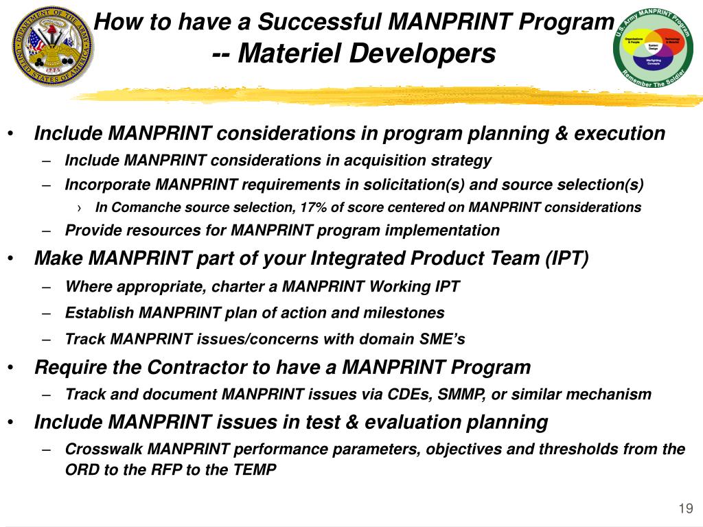 How to have a Successful MANPRINT Program -- Materiel Developers • Include MANPRINT considerations in program planning & execution • Include MANPRINT considerations in acquisition strategy • Incorporate MANPRINT requirements in solicitation(s) and source selection(s) • In Comanche source selection, 17% of score centered on MANPRINT considerations • Provide resources for MANPRINT program implementation • Make MANPRINT part of your Integrated Product Team (IPT) • Where appropriate, charter a MANPRINT Working IPT • Establish MANPRINT plan of action and milestones • Track MANPRINT issues/concerns with domain SME’s • Require the Contractor to have a MANPRINT Program • Track and document MANPRINT issues via CDEs, SMMP, or similar mechanism • Include MANPRINT issues in test & evaluation planning • Crosswalk MANPRINT performance parameters, objectives and thresholds from the ORD to the RFP to the TEMP