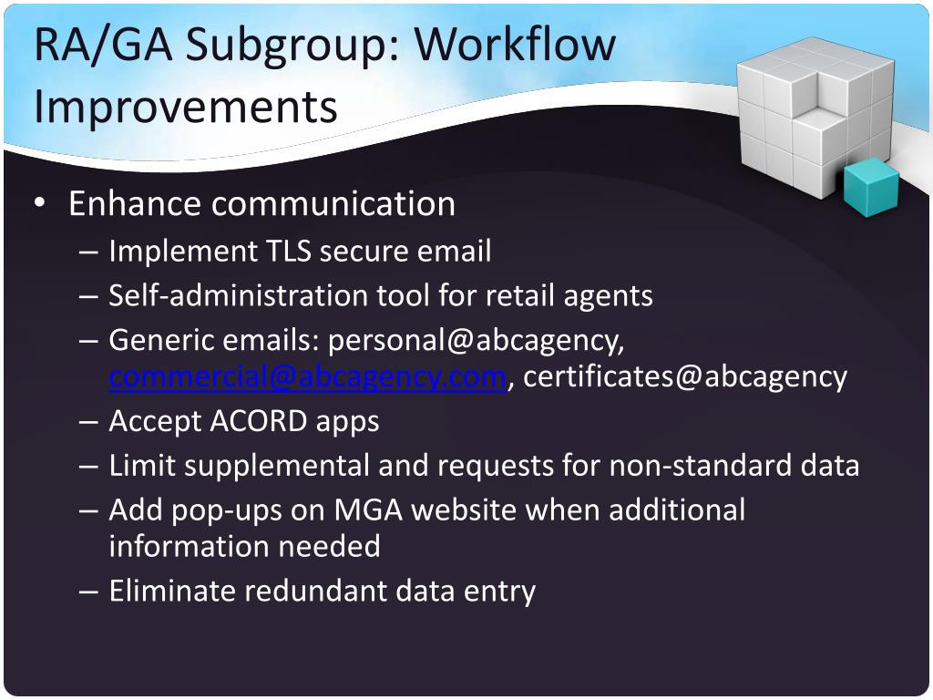RA/GA Subgroup: Workflow Improvements • Enhance communication • Implement TLS secure email • Self-administration tool for retail agents • Generic emails: personal@abcagency, commercial@abcagency.com, certificates@abcagency • Accept ACORD apps • Limit supplemental and requests for non-standard data • Add pop-ups on MGA website when additional information needed • Eliminate redundant data entry