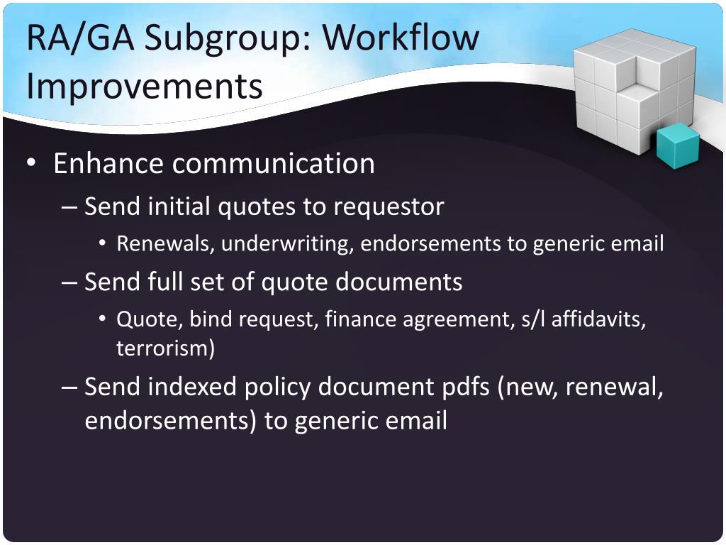 RA/GA Subgroup: Workflow Improvements • Enhance communication • Send initial quotes to requestor • Renewals, underwriting, endorsements to generic email • Send full set of quote documents • Quote, bind request, finance agreement, s/l affidavits, terrorism) • Send indexed policy document pdfs (new, renewal, endorsements) to generic email