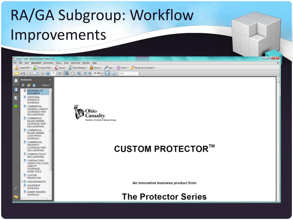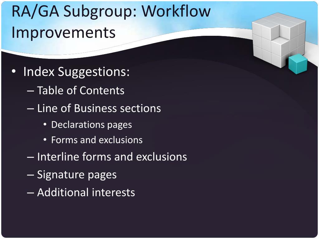 RA/GA Subgroup: Workflow Improvements • Index Suggestions: • Table of Contents • Line of Business sections • Declarations pages • Forms and exclusions • Interline forms and exclusions • Signature pages • Additional interests