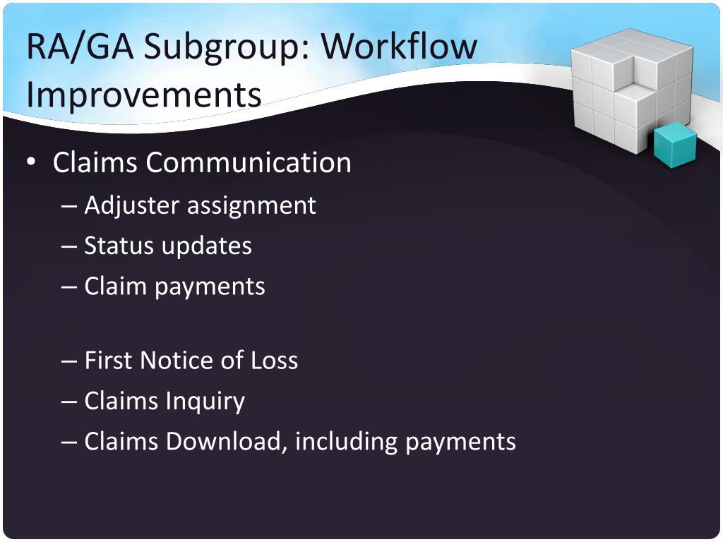 RA/GA Subgroup: Workflow Improvements • Claims Communication • Adjuster assignment • Status updates • Claim payments • First Notice of Loss • Claims Inquiry • Claims Download, including payments