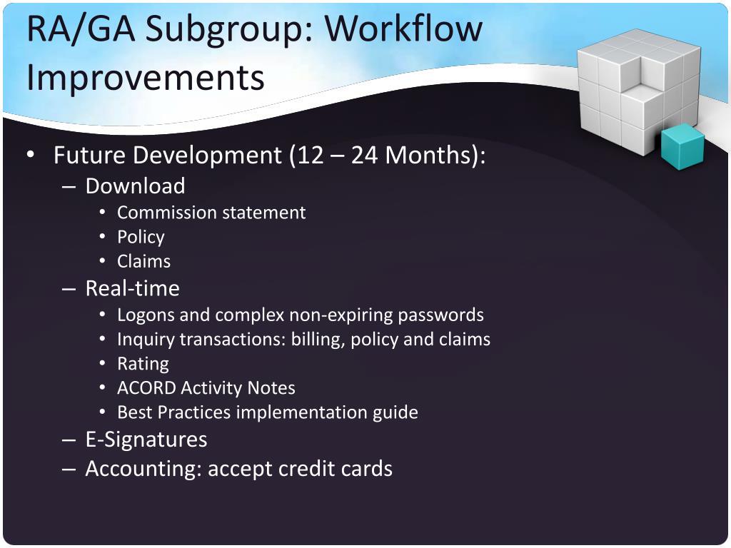 RA/GA Subgroup: Workflow Improvements • Future Development (12 – 24 Months): • Download • Commission statement • Policy • Claims • Real-time • Logons and complex non-expiring passwords • Inquiry transactions: billing, policy and claims • Rating • ACORD Activity Notes • Best Practices implementation guide • E-Signatures • Accounting: accept credit cards