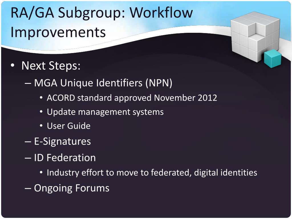 RA/GA Subgroup: Workflow Improvements • Next Steps: • MGA Unique Identifiers (NPN) • ACORD standard approved November 2012 • Update management systems • User Guide • E-Signatures • ID Federation • Industry effort to move to federated, digital identities • Ongoing Forums