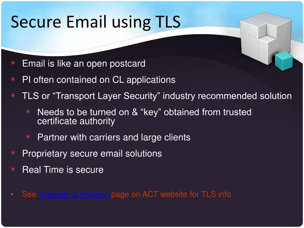 Secure Email using TLS • Email islike an open postcard • PI often contained on CL applications • TLS or “Transport Layer Security” industry recommended solution • Needs to be turned on & “key” obtained from trusted certificate authority • Partner with carriers and large clients • Proprietary secure email solutions • Real Time is secure • See “Security & Privacy” page on ACT website for TLS info