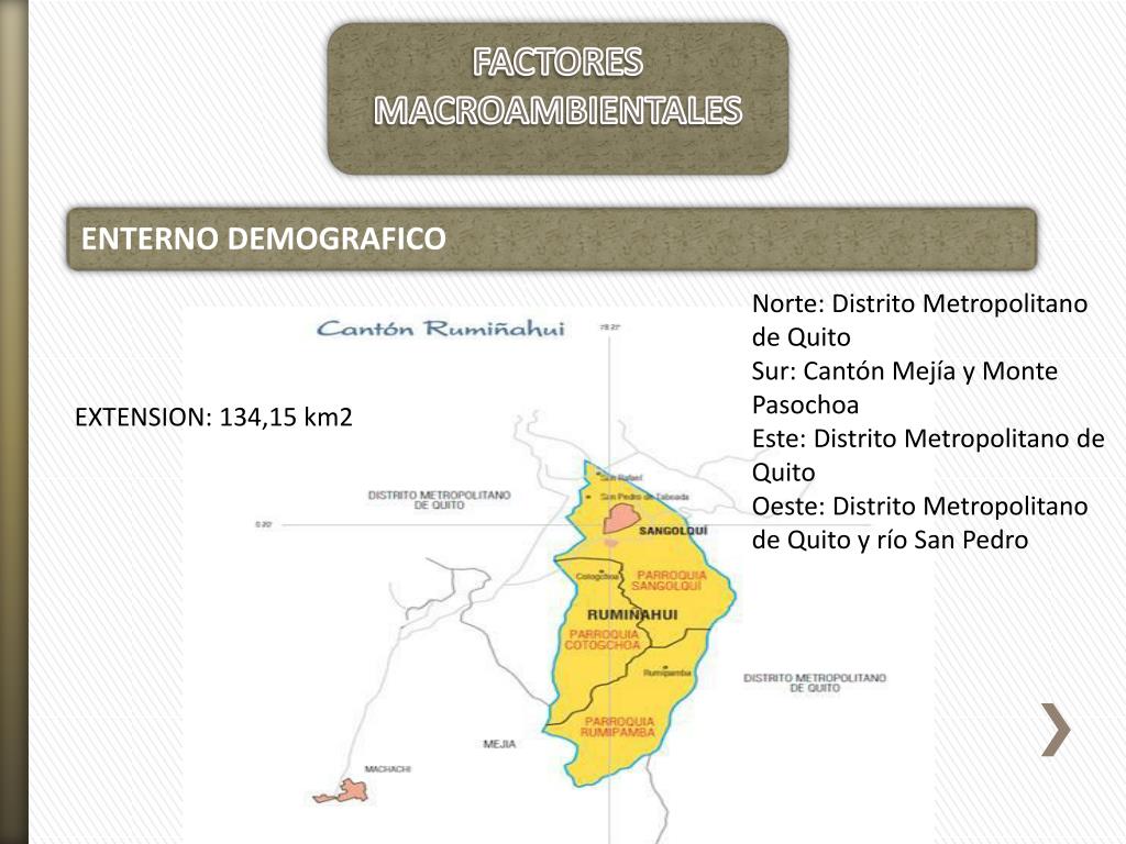 FACTORESMACROAMBIENTALES • Norte: Distrito Metropolitano de Quito • Sur: Cantón Mejía y Monte Pasochoa • Este: Distrito Metropolitano de Quito • Oeste: Distrito Metropolitano de Quito y río San Pedro • ENTERNO DEMOGRAFICO EXTENSION: 134,15 km2