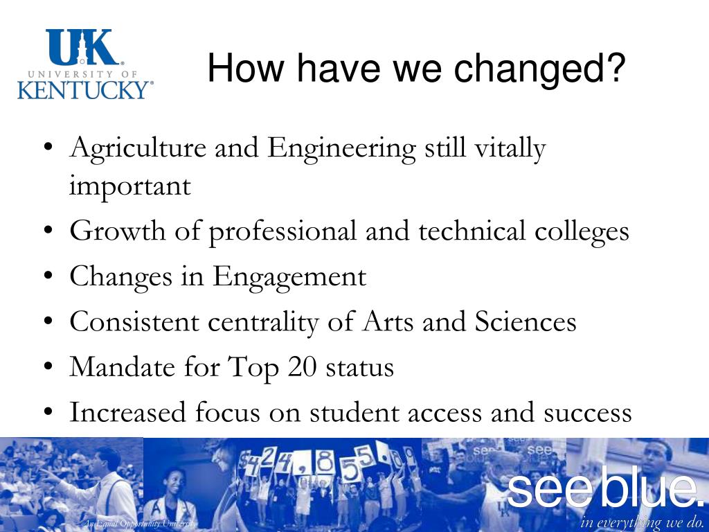 How have we changed? • Agriculture and Engineering still vitally important • Growth of professional and technical colleges • Changes in Engagement • Consistent centrality of Arts and Sciences • Mandate for Top 20 status • Increased focus on student access and success