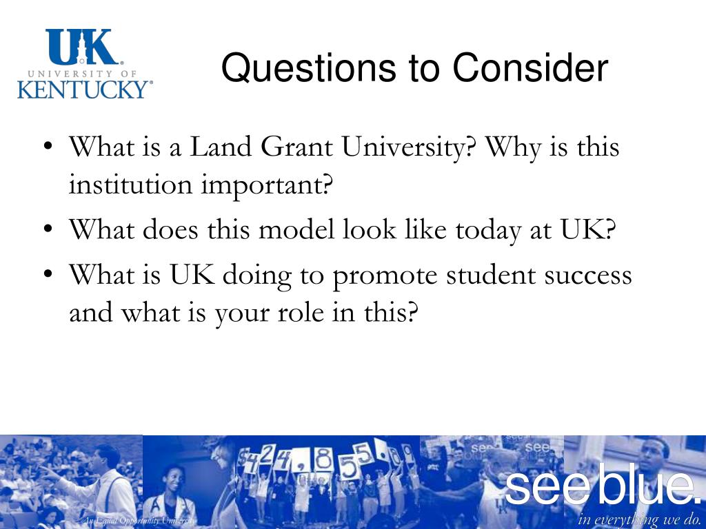 Questions to Consider • What is a Land Grant University? Why is this institution important? • What does this model look like today at UK? • What is UK doing to promote student success and what is your role in this?