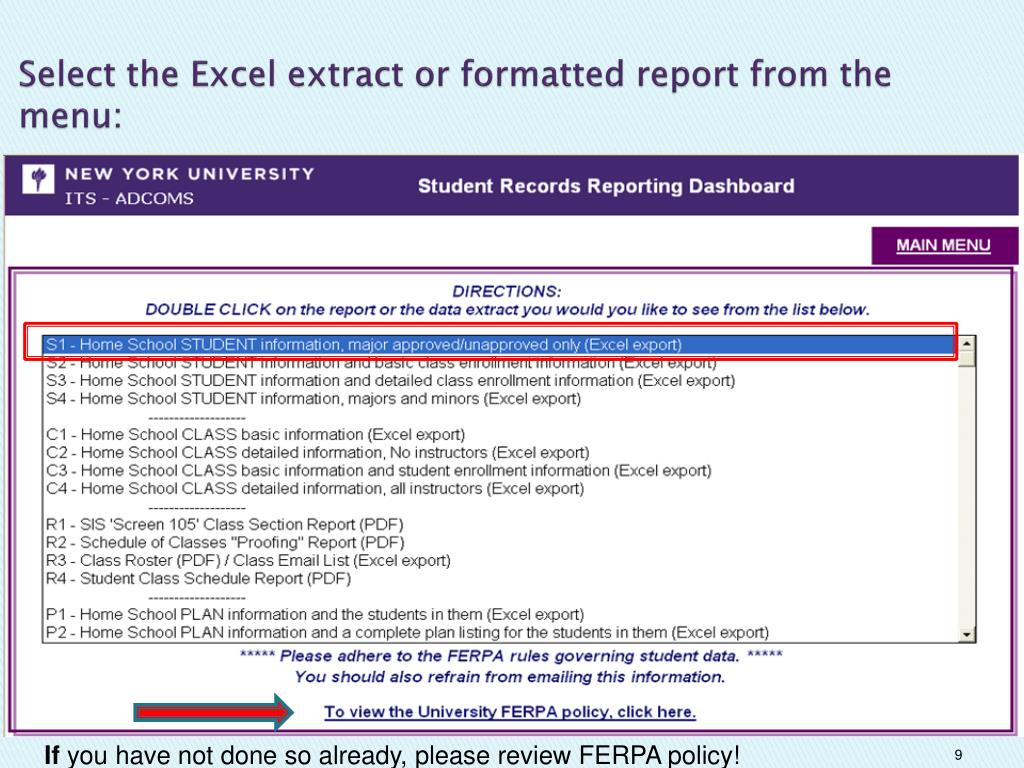 Select the Excel extract or formatted report from the menu: If you have not done so already, please review FERPA policy!