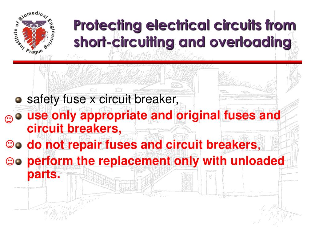 Protecting electrical circuits from short-circuiting and overloading • safety fuse x circuit breaker, • use only appropriate and original fuses and circuit breakers, • do not repair fuses and circuit breakers, • perform the replacement only with unloaded parts.