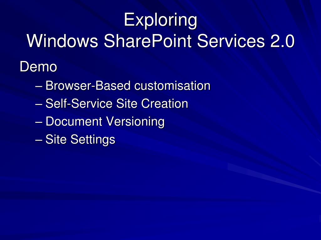 Exploring Windows SharePoint Services 2.0 Demo • Browser-Based customisation • Self-Service Site Creation • Document Versioning • Site Settings