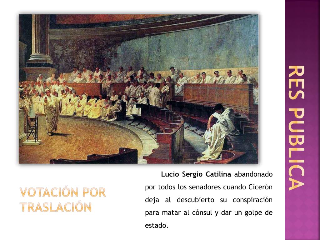 Res publica • Lucio Sergio Catilinaabandonado por todos los senadores cuando Cicerón deja al descubierto su conspiración para matar al cónsul y dar un golpe de estado. Votación por traslación