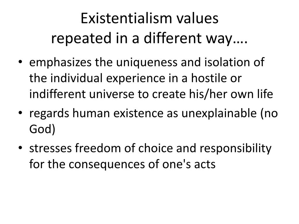 Existentialism valuesrepeated in a different way…. • emphasizes the uniqueness and isolation of the individual experience in a hostile or indifferent universeto create his/her own life • regards human existence as unexplainable (no God) • stresses freedom of choice and responsibility for the consequences of one's acts
