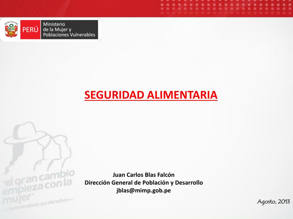SEGURIDAD ALIMENTARIA Juan Carlos Blas Falcón Dirección General de Población y Desarrollo jblas@mimp.gob.pe Agosto, 2013