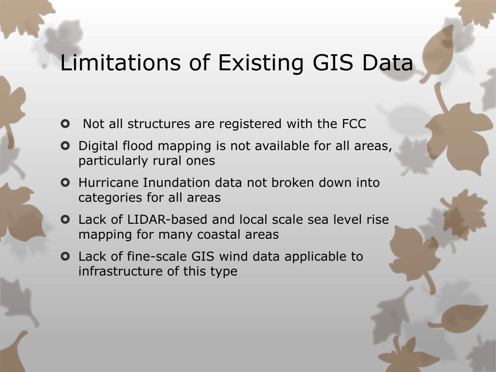 Limitations of Existing GIS Data • Not all structures are registered with the FCC • Digital flood mapping is not available for all areas, particularly rural ones • Hurricane Inundation data not broken down into categories for all areas • Lack of LIDAR-based and local scale sea level rise mapping for many coastal areas • Lack of fine-scale GIS wind data applicable to infrastructure of this type