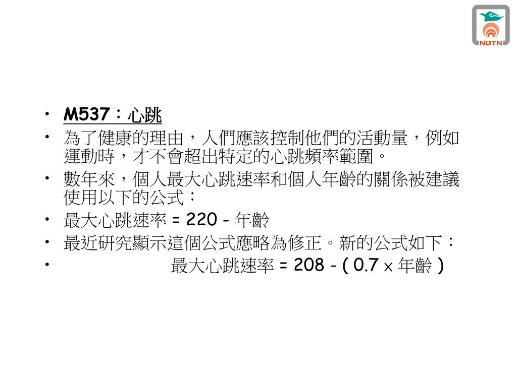 M537:心跳 • 為了健康的理由,人們應該控制他們的活動量,例如運動時,才不會超出特定的心跳頻率範圍。 • 數年來,個人最大心跳速率和個人年齡的關係被建議使用以下的公式: • 最大心跳速率 = 220 - 年齡 • 最近研究顯示這個公式應略為修正。新的公式如下: • 最大心跳速率 = 208 - ( 0.7 × 年齡 )