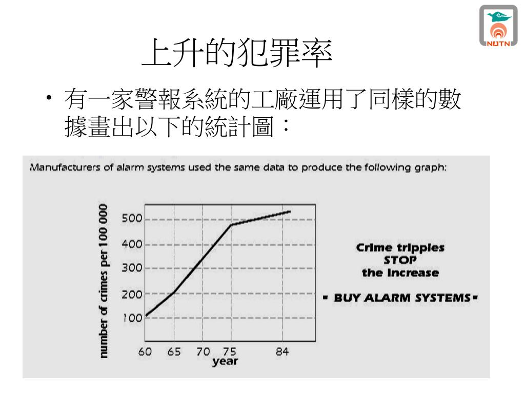 上升的犯罪率 • 有一家警報系統的工廠運用了同樣的數據畫出以下的統計圖: