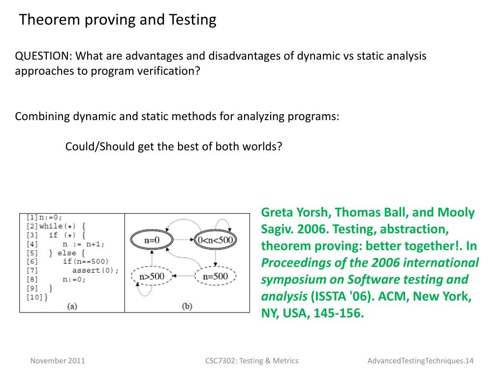 Theoremproving and Testing • QUESTION: What are advantages and disadvantages of dynamic vs static analysis approaches to program verification? • Combiningdynamicand static methods for analyzing programs: • Could/Should get the best of both worlds? Greta Yorsh, Thomas Ball, and MoolySagiv. 2006. Testing, abstraction, theorem proving: better together!. In Proceedings of the 2006 international symposium on Software testing and analysis (ISSTA '06). ACM, New York, NY, USA, 145-156. CSC7302: Testing & Metrics