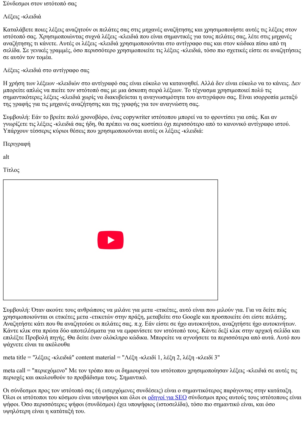 Σύνδεσμοι στον ιστότοπό σας Λέξεις -κλειδιά Καταλάβετε ποιες λέξεις αναζητούν οι πελάτες σας στις μηχανές αναζήτησης και χρησιμοποιήστε αυτές τις λέξεις στον ιστότοπό σας. Χρησιμοποιώντας συχνά λέξεις -κλειδιά που είναι σημαντικές για τους πελάτες σας, λέτε στις μηχανές αναζήτησης τι κάνετε. Αυτές οι λέξεις -κλειδιά χρησιμοποιούνται στο αντίγραφο σας και στον κώδικα πίσω από τη σελίδα. Σε γενικές γραμμές, όσο περισσότερο χρησιμοποιείτε τις λέξεις -κλειδιά, τόσο πιο σχετικές είστε σε αναζητήσεις σε αυτόν τον τομέα. Λέξεις -κλειδιά στο αντίγραφο σας Η χρήση των λέξεων -κλειδιών στο αντίγραφό σας είναι εύκολο να κατανοηθεί. Αλλά δεν είναι εύκολο να το κάνεις. Δεν μπορείτε απλώς να πιείτε τον ιστότοπό σας με μια άσκοπη σειρά λέξεων. Το τέχνασμα χρησιμοποιεί πολύ τις σημαντικότερες λέξεις -κλειδιά χωρίς να διακυβεύεται η αναγνωσιμότητα του αντιγράφου σας. Είναι ισορροπία μεταξύ της γραφής για τις μηχανές αναζήτησης και της γραφής για τον αναγνώστη σας. Συμβουλή: Εάν το βρείτε πολύ χρονοβόρο, ένας copywriter ιστότοπου μπορεί να το φροντίσει για εσάς. Και αν γνωρίζετε τις λέξεις -κλειδιά σας ήδη, θα πρέπει να σας κοστίσει όχι περισσότερο από το κανονικό αντίγραφο ιστού. Υπάρχουν τέσσερις κύριοι θέσεις που χρησιμοποιούνται αυτές οι λέξεις -κλειδιά: Περιγραφή alt Τίτλος Συμβουλή: Όταν ακούτε τους ανθρώπους να μιλάνε για μετα -ετικέτες, αυτό είναι που μιλούν για. Για να δείτε πώς χρησιμοποιούνται οι ετικέτες μετα -ετικετών στην πράξη, μεταβείτε στο Google και προσποιείτε ότι είστε πελάτης. Αναζητήστε κάτι που θα αναζητούσε οι πελάτες σας. π.χ. Εάν είστε σε ήχο αυτοκινήτου, αναζητήστε ήχο αυτοκινήτων. Κάντε κλικ στα πρώτα δύο αποτελέσματα για να εμφανίσετε τον ιστότοπό τους. Κάντε δεξί κλικ στην αρχική σελίδα και επιλέξτε Προβολή πηγής. Θα δείτε έναν ολόκληρο κώδικα. Μπορείτε να αγνοήσετε τα περισσότερα από αυτά. Αυτό που ψάχνετε είναι τα ακόλουθα meta title = "λέξεις -κλειδιά" content material = "Λέξη -κλειδί 1, λέξη 2, λέξη -κλειδί 3" meta call = "περιεχόμενο" Με τον τρόπο που οι δημιουργοί του ιστότοπου χρησιμοποίησαν λέξεις -κλειδιά σε αυτές τις περιοχές και ακολουθούν το προβάδισμα τους. Σημαντικό. Οι σύνδεσμοι προς τον ιστότοπό σας (ή εισερχόμενες συνδέσεις) είναι ο σημαντικότερος παράγοντας στην κατάταξη. Όλοι οι ιστότοποι του κόσμου είναι υποψήφιοι και όλοι οι οδηγοί για SEO σύνδεσμοι προς αυτούς τους ιστότοπους είναι ψήφοι. Όσο περισσότερες ψήφοι (συνδέσμοι) έχει υποψήφιος (ιστοσελίδα), τόσο πιο σημαντικό είναι, και όσο υψηλότερη είναι η κατάταξή του.