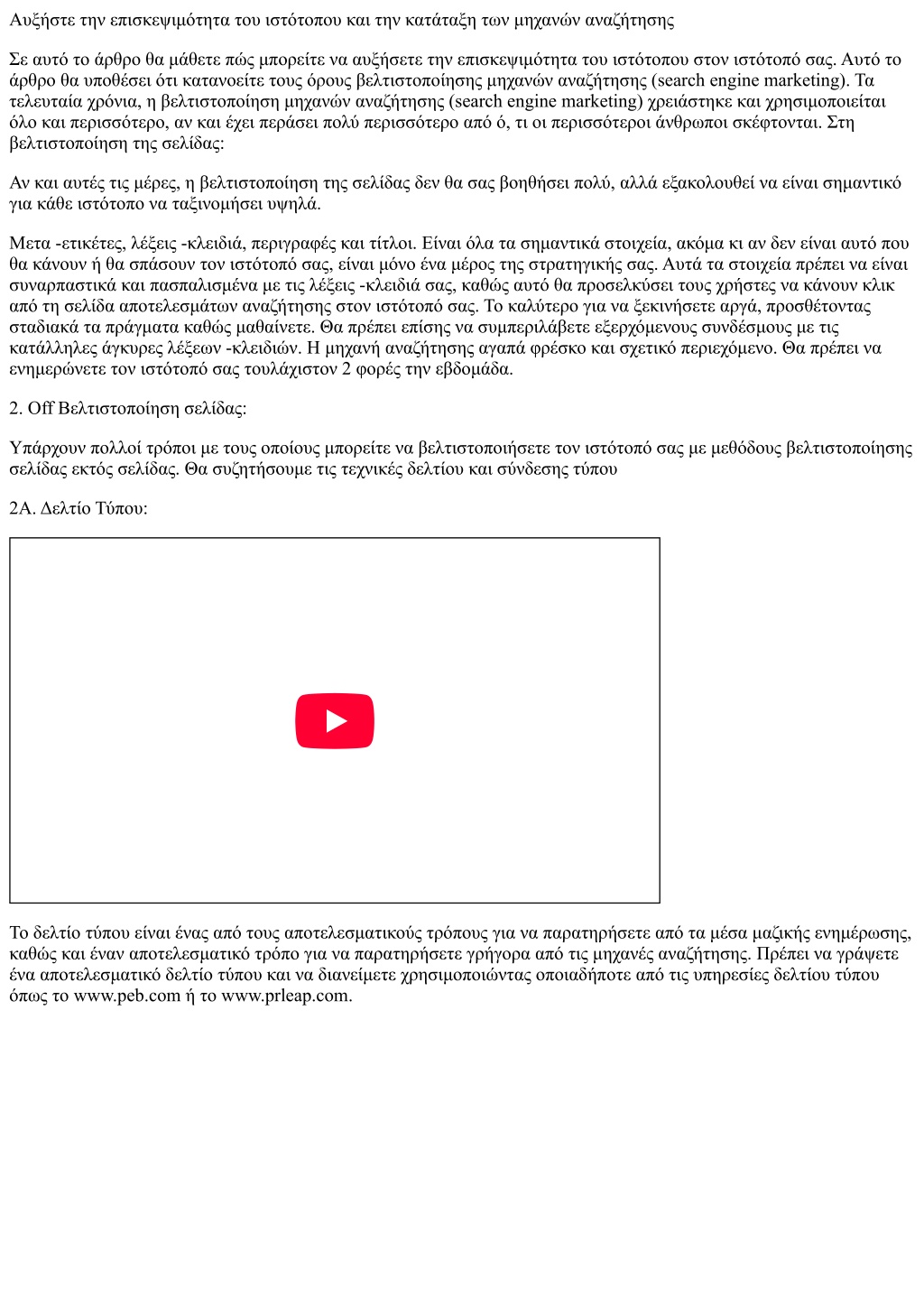 Αυξήστε την επισκεψιμότητα του ιστότοπου και την κατάταξη των μηχανών αναζήτησης Σε αυτό το άρθρο θα μάθετε πώς μπορείτε να αυξήσετε την επισκεψιμότητα του ιστότοπου στον ιστότοπό σας. Αυτό το άρθρο θα υποθέσει ότι κατανοείτε τους όρους βελτιστοποίησης μηχανών αναζήτησης (search engine marketing). Τα τελευταία χρόνια, η βελτιστοποίηση μηχανών αναζήτησης (search engine marketing) χρειάστηκε και χρησιμοποιείται όλο και περισσότερο, αν και έχει περάσει πολύ περισσότερο από ό, τι οι περισσότεροι άνθρωποι σκέφτονται. Στη βελτιστοποίηση της σελίδας: Αν και αυτές τις μέρες, η βελτιστοποίηση της σελίδας δεν θα σας βοηθήσει πολύ, αλλά εξακολουθεί να είναι σημαντικό για κάθε ιστότοπο να ταξινομήσει υψηλά. Μετα -ετικέτες, λέξεις -κλειδιά, περιγραφές και τίτλοι. Είναι όλα τα σημαντικά στοιχεία, ακόμα κι αν δεν είναι αυτό που θα κάνουν ή θα σπάσουν τον ιστότοπό σας, είναι μόνο ένα μέρος της στρατηγικής σας. Αυτά τα στοιχεία πρέπει να είναι συναρπαστικά και πασπαλισμένα με τις λέξεις -κλειδιά σας, καθώς αυτό θα προσελκύσει τους χρήστες να κάνουν κλικ από τη σελίδα αποτελεσμάτων αναζήτησης στον ιστότοπό σας. Το καλύτερο για να ξεκινήσετε αργά, προσθέτοντας σταδιακά τα πράγματα καθώς μαθαίνετε. Θα πρέπει επίσης να συμπεριλάβετε εξερχόμενους συνδέσμους με τις κατάλληλες άγκυρες λέξεων -κλειδιών. Η μηχανή αναζήτησης αγαπά φρέσκο και σχετικό περιεχόμενο. Θα πρέπει να ενημερώνετε τον ιστότοπό σας τουλάχιστον 2 φορές την εβδομάδα. 2. Off Βελτιστοποίηση σελίδας: Υπάρχουν πολλοί τρόποι με τους οποίους μπορείτε να βελτιστοποιήσετε τον ιστότοπό σας με μεθόδους βελτιστοποίησης σελίδας εκτός σελίδας. Θα συζητήσουμε τις τεχνικές δελτίου και σύνδεσης τύπου 2Α. Δελτίο Τύπου: Το δελτίο τύπου είναι ένας από τους αποτελεσματικούς τρόπους για να παρατηρήσετε από τα μέσα μαζικής ενημέρωσης, καθώς και έναν αποτελεσματικό τρόπο για να παρατηρήσετε γρήγορα από τις μηχανές αναζήτησης. Πρέπει να γράψετε ένα αποτελεσματικό δελτίο τύπου και να διανείμετε χρησιμοποιώντας οποιαδήποτε από τις υπηρεσίες δελτίου τύπου όπως το www.peb.com ή το www.prleap.com.