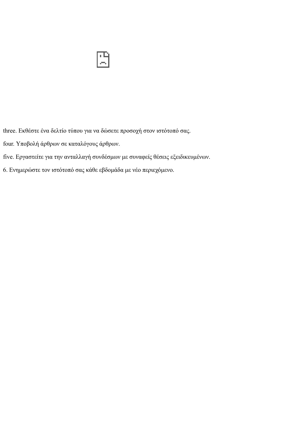 three. Εκθέστε ένα δελτίο τύπου για να δώσετε προσοχή στον ιστότοπό σας. four. Υποβολή άρθρων σε καταλόγους άρθρων. five. Εργαστείτε για την ανταλλαγή συνδέσμων με συναφείς θέσεις εξειδικευμένων. 6. Ενημερώστε τον ιστότοπό σας κάθε εβδομάδα με νέο περιεχόμενο.