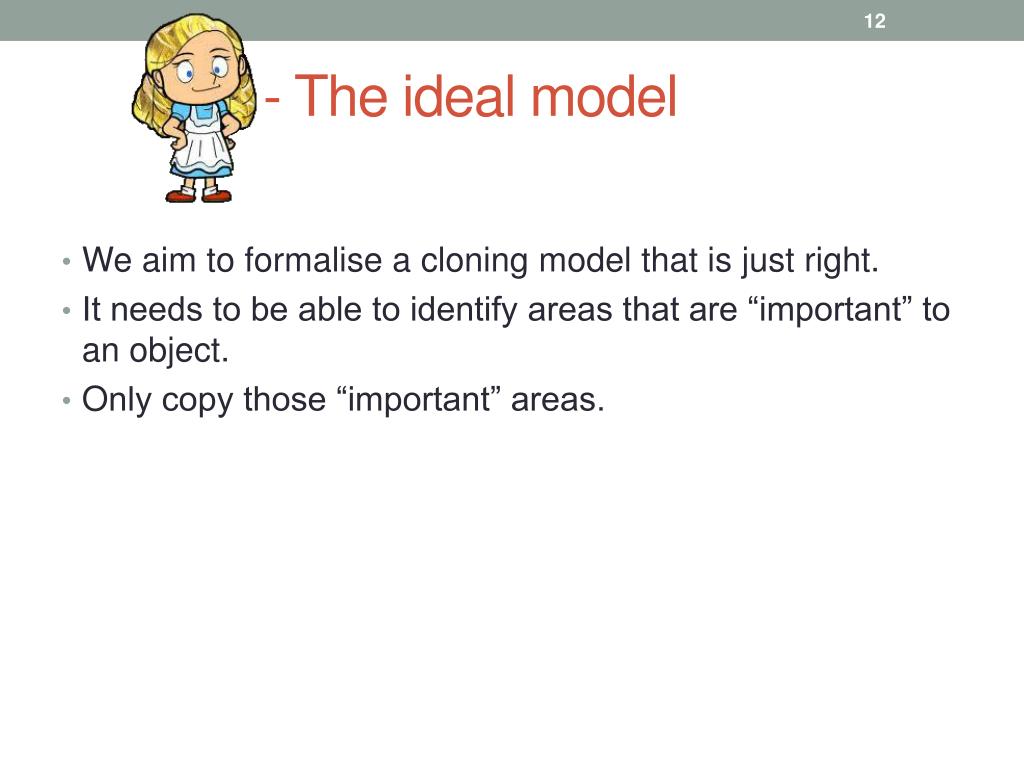 - The ideal model • We aim to formalise a cloning model that is just right. • It needs to be able to identify areas that are “important” to an object. • Only copy those “important” areas.