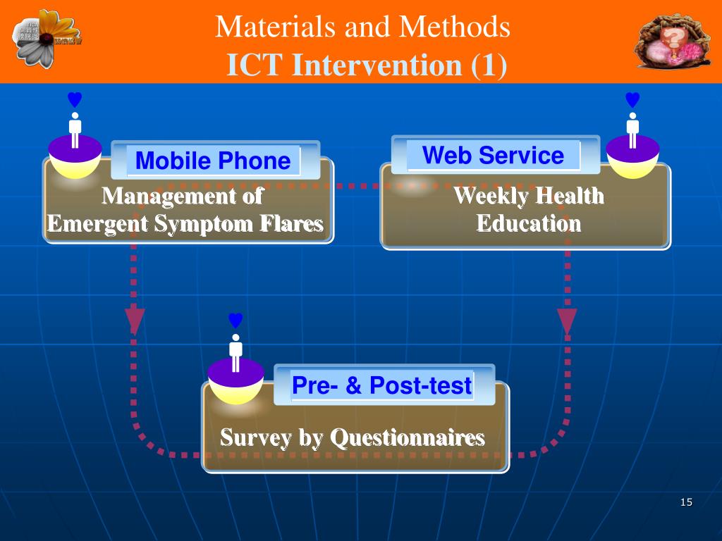 ♥ ♥ ♥ Mobile Phone Pre- & Post-test Management of Emergent Symptom Flares Web Service Survey by Questionnaires Weekly Health Education Materials and Methods ICT Intervention (1) 15