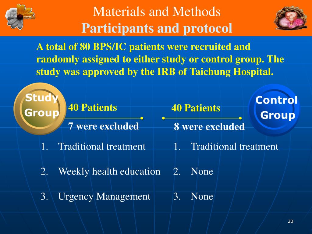Control Group Materials and MethodsParticipants and protocol A total of 80 BPS/IC patients were recruited and randomly assigned to either study or control group. The study was approved by the IRB of Taichung Hospital. Study Group 40 Patients 7 were excluded 40 Patients 8 were excluded Traditional treatment Weekly health education Urgency Management Traditional treatment None None