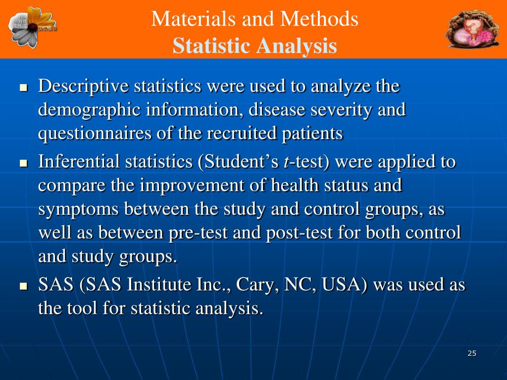 Materials and MethodsStatistic Analysis • Descriptive statistics were used to analyze the demographic information, disease severity and questionnaires of the recruited patients • Inferential statistics (Student’s t-test) were applied to compare the improvement of health status and symptoms between the study and control groups, as well as between pre-test and post-test for both control and study groups. • SAS (SAS Institute Inc., Cary, NC, USA) was used as the tool for statistic analysis. 25