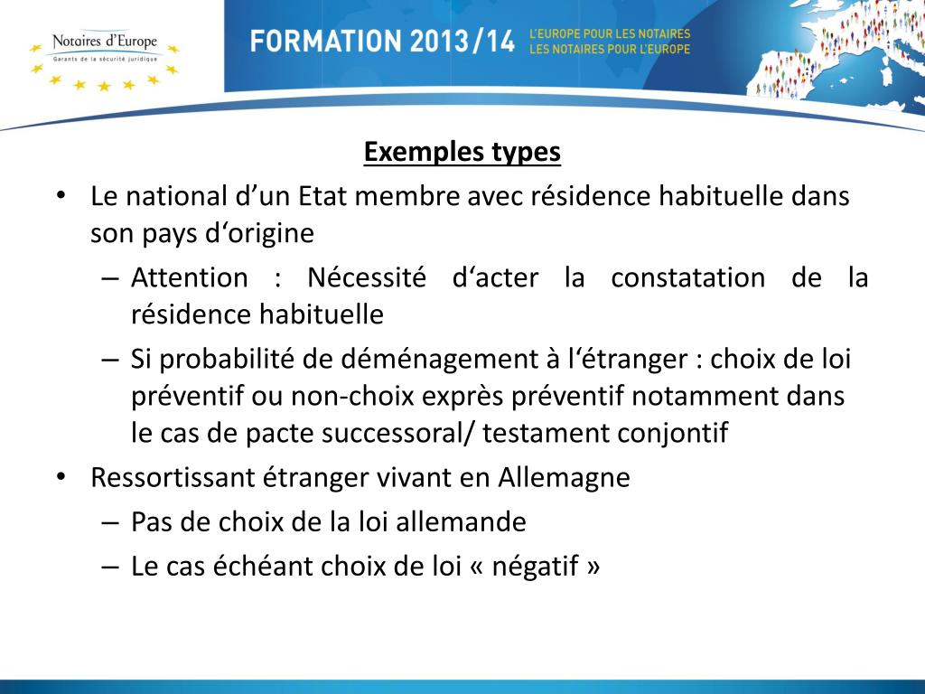 Exemples types • Le national d’un Etat membre avec résidence habituelle dans son pays d‘origine • Attention : Nécessité d‘acter la constatation de la résidence habituelle • Si probabilité de déménagement à l‘étranger : choix de loi préventif ou non-choix exprès préventif notamment dans le cas de pacte successoral/ testament conjontif • Ressortissant étranger vivant en Allemagne • Pas de choix de la loi allemande • Le cas échéant choix de loi « négatif »