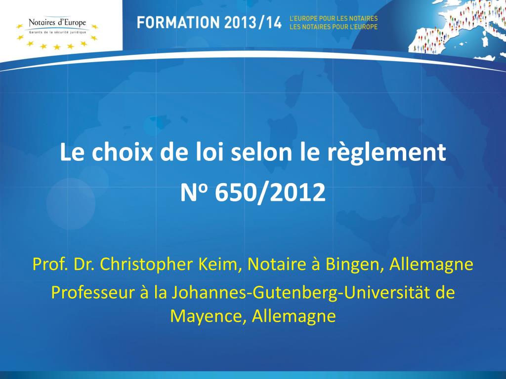 Le choix de loi selon le règlement No 650/2012 Prof. Dr. Christopher Keim, Notaire à Bingen, Allemagne Professeur à la Johannes-Gutenberg-Universität de Mayence, Allemagne