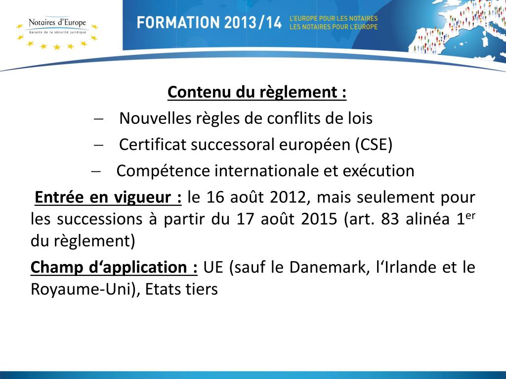 Contenu du règlement : • Nouvelles règles de conflits de lois • Certificat successoral européen (CSE) • Compétence internationale et exécution • Entrée en vigueur : le 16 août 2012, mais seulement pour les successions à partir du 17 août 2015 (art. 83 alinéa 1er du règlement) • Champ d‘application : UE (sauf le Danemark, l‘Irlande et le Royaume-Uni), Etats tiers