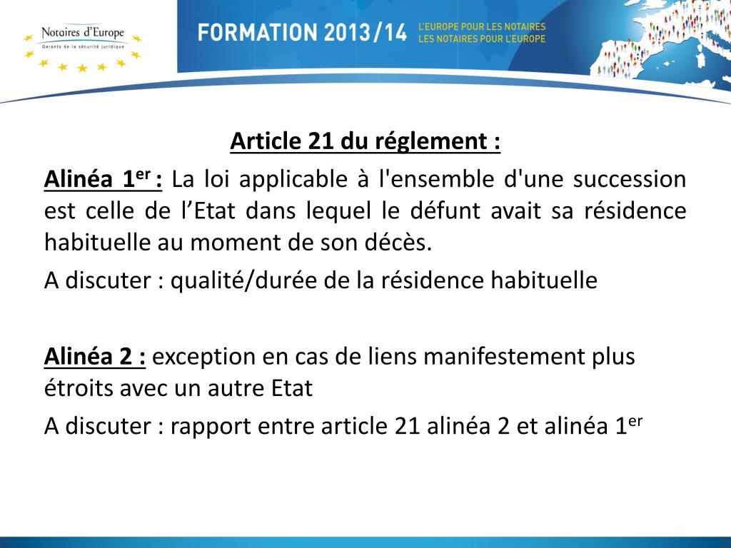 Article 21 du réglement : Alinéa 1er :La loi applicable à l'ensemble d'une succession est celle de l’Etat dans lequel le défunt avait sa résidence habituelle au moment de son décès. A discuter : qualité/durée de la résidence habituelle Alinéa 2 :exception en cas de liens manifestement plus étroits avec un autre Etat A discuter : rapport entre article 21 alinéa 2 et alinéa 1er