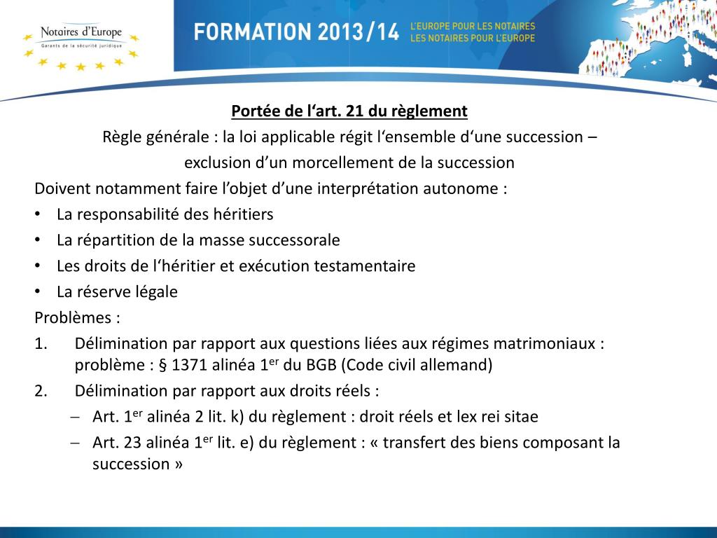 Portée de l‘art. 21 du règlement • Règle générale : la loi applicable régit l‘ensemble d‘une succession – • exclusion d’un morcellement de la succession • Doivent notamment faire l’objet d’une interprétation autonome: • La responsabilité des héritiers • La répartition de la masse successorale • Les droits de l‘héritier et exécution testamentaire • La réserve légale • Problèmes : • Délimination par rapport aux questions liées aux régimes matrimoniaux : problème : § 1371 alinéa 1er du BGB (Code civil allemand) • Délimination par rapport aux droits réels : • Art. 1er alinéa 2 lit. k) du règlement : droit réels et lex rei sitae • Art. 23 alinéa 1er lit. e) du règlement : « transfert des biens composant la succession »