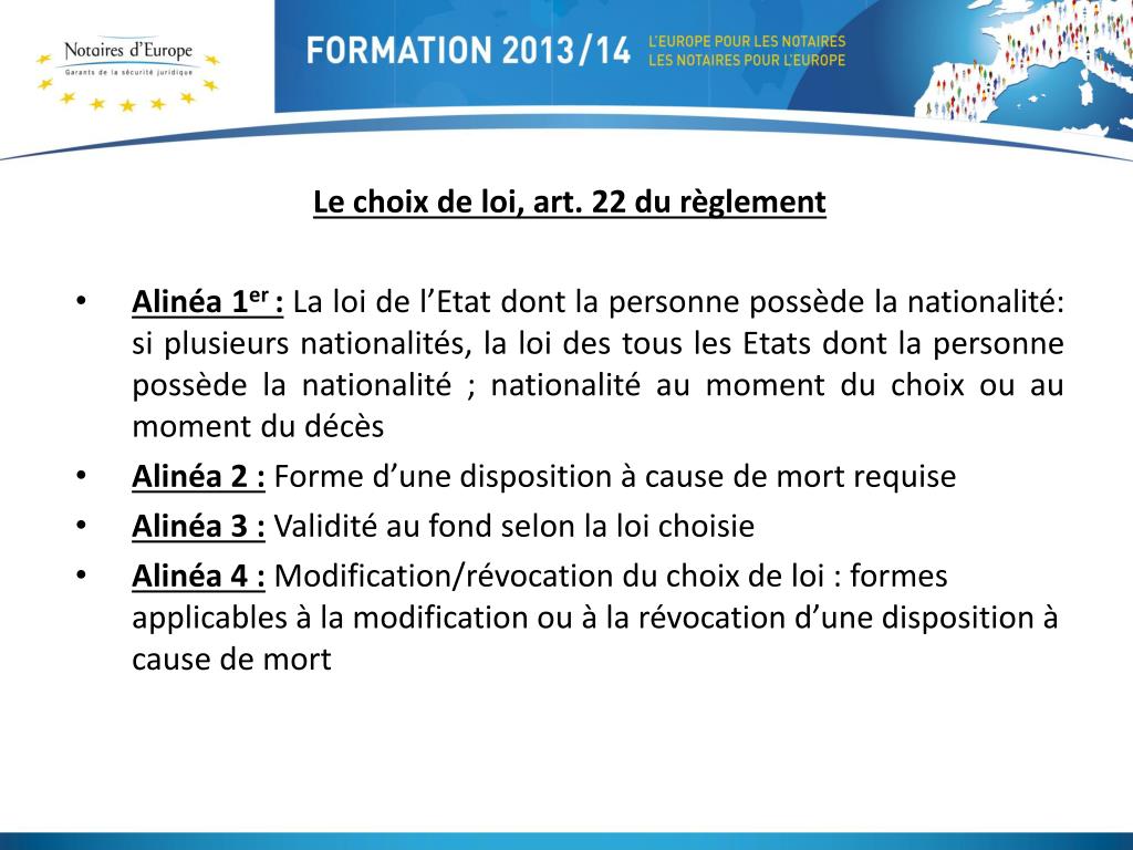 Le choix de loi, art. 22 du règlement • Alinéa 1er :La loi de l’Etat dont la personne possède la nationalité: si plusieurs nationalités, la loi des tous les Etats dont la personne possède la nationalité ; nationalité au moment du choix ou au moment du décès • Alinéa 2 :Forme d’une disposition à cause de mort requise • Alinéa 3 :Validité au fond selon la loi choisie • Alinéa 4 :Modification/révocation du choix de loi : formes applicables à la modification ou à la révocation d’une disposition à cause de mort