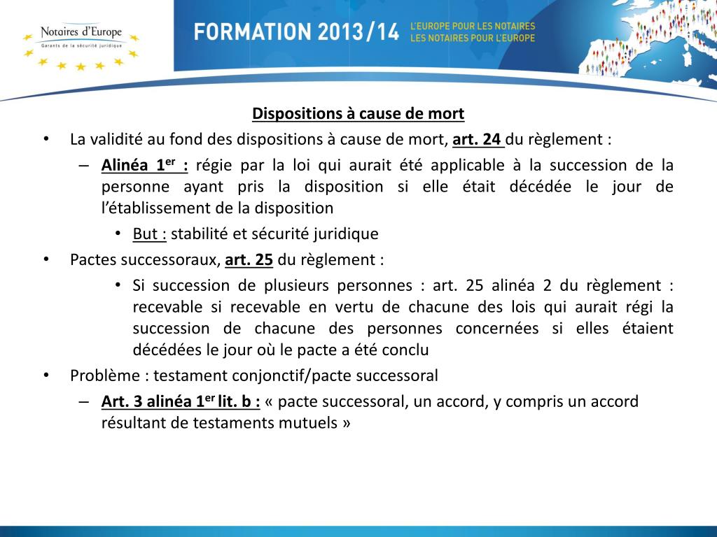 Dispositions à cause de mort • La validité au fond des dispositions à cause de mort, art. 24 du règlement : • Alinéa 1er: régie par la loi qui aurait été applicable à la succession de la personne ayant pris la disposition si elle était décédée le jour de l’établissement de la disposition • But : stabilité et sécurité juridique • Pactes successoraux, art. 25du règlement : • Si succession de plusieurs personnes : art. 25 alinéa 2 du règlement : recevable si recevable en vertu de chacune des lois qui aurait régi la succession de chacune des personnes concernées si elles étaient décédées le jour où le pacte a été conclu • Problème : testament conjonctif/pacte successoral • Art. 3 alinéa 1er lit. b :« pacte successoral, un accord, y compris un accord résultant de testaments mutuels »