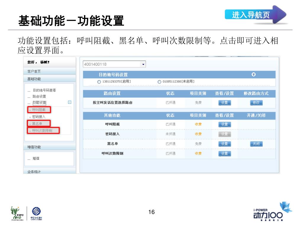 移动 400 仿真演示 PPT. 移动 400 简介. 移动 400 业务为企业提供全国统一的 4001 号码,企业可根据主叫位置、时间、话务比例等多种规则,将客户来电转接至事先设定好的电话号码上,具有呼叫拦截、呼入次数限制、黑名单管理、密码接入等功能。传统语音业务外,移动 400 业务还提供短信上传下发服务,让信息准确传递,实现企业与客户的立体沟通。. 功能演示. 移动 400 登录. 进入导航页. 集团客户进入移动 400 网站 www.chinamobile400.com ,输入正确的用户名、密码和验证码,单击“登录”按钮,即可进入移动 400 网站系统主界面。.