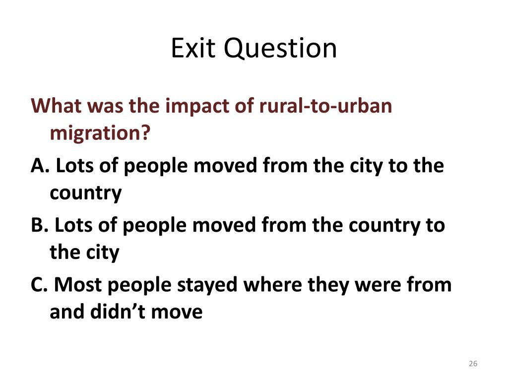 Exit Question What was the impact of rural-to-urban migration? A. Lots of people moved from the city to the country B. Lots of people moved from the country to the city C. Most people stayed where they were from and didn’t move
