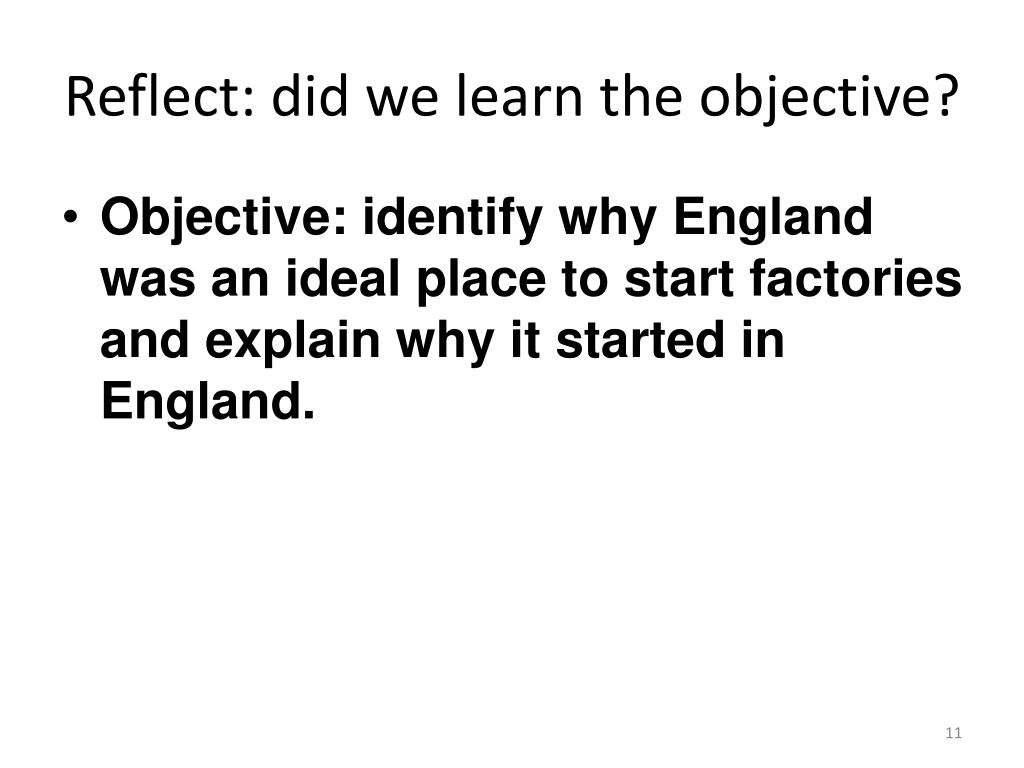 Reflect: did we learn the objective? Objective: identify why England was an ideal place to start factories and explain why it started in England.