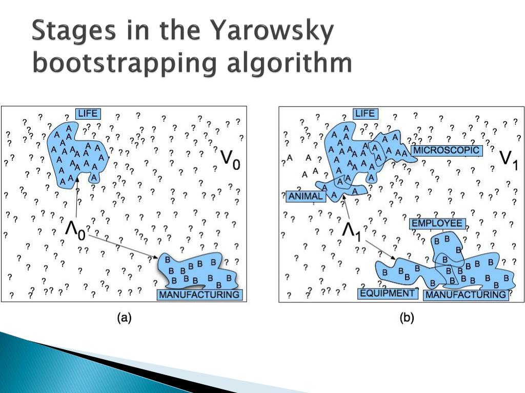 Where do the seeds come from? • Hand labeling • “One sense per discourse”: • The sense of a word is highly consistent within a document - Yarowsky (1995) • True for topic dependent words • Not so true for other POS like adjectives and verbs, e.g. make, take • Krovetz (1998) “More than one sense per discourse” argues it isn’t true at all once you move to fine-grained senses • One sense per collocation: • A word reoccurring in collocation with the same word will almost surely have the same sense. Slide adapted from Chris Manning
