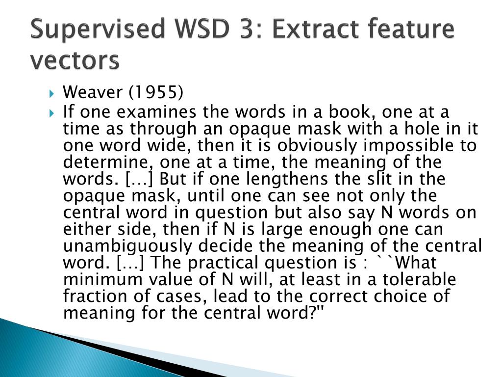 Supervised WSD 3: Extract feature vectors • Weaver (1955) • If one examines the words in a book, one at a time as through an opaque mask with a hole in it one word wide, then it is obviously impossible to determine, one at a time, the meaning of the words. […] But if one lengthens the slit in the opaque mask, until one can see not only the central word in question but also say N words on either side, then if N is large enough one can unambiguously decide the meaning of the central word. […] The practical question is : ``What minimum value of N will, at least in a tolerable fraction of cases, lead to the correct choice of meaning for the central word?''
