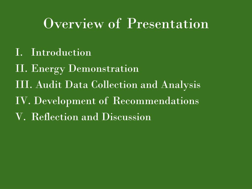 Overview of Presentation • Introduction • Energy Demonstration • Audit Data Collection and Analysis • Development of Recommendations • Reflection and Discussion