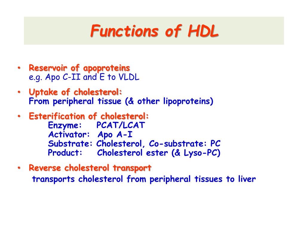 Functions of HDL Reservoir of apoproteinse.g. Apo C-II and E to VLDL Uptake of cholesterol:From peripheral tissue (& other lipoproteins) Esterification of cholesterol:Enzyme: PCAT/LCAT Activator: Apo A-I Substrate: Cholesterol, Co-substrate: PC Product: Cholesterol ester (& Lyso-PC) Reverse cholesterol transport transports cholesterol from peripheral tissues to liver