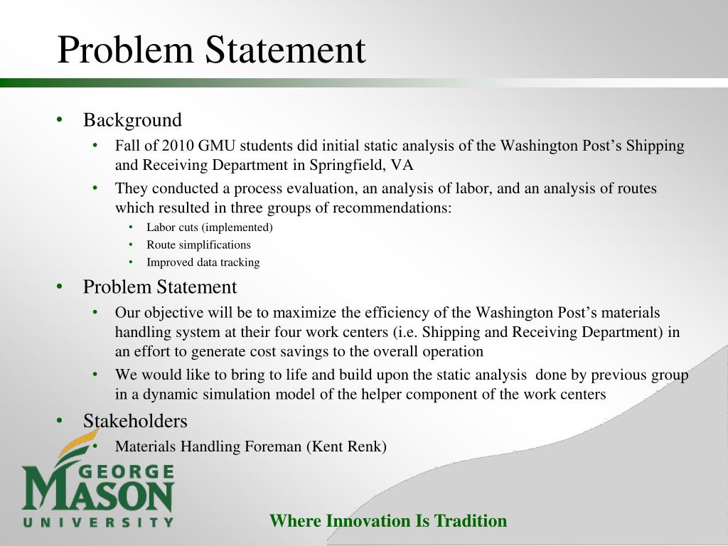 Background Fall of 2010 GMU students did initial static analysis of the Washington Post’s Shipping and Receiving Department in Springfield, VA They conducted a process evaluation, an analysis of labor, and an analysis of routes which resulted in three groups of recommendations: Labor cuts (implemented) Route simplifications Improved data tracking Problem Statement Our objective will be to maximize the efficiency of the Washington Post’s materials handling system at their four work centers (i.e. Shipping and Receiving Department) in an effort to generate cost savings to the overall operation We would like to bring to life and build upon the static analysis done by previous group in a dynamic simulation model of the helper component of the work centers Stakeholders Materials Handling Foreman (Kent Renk) Problem Statement